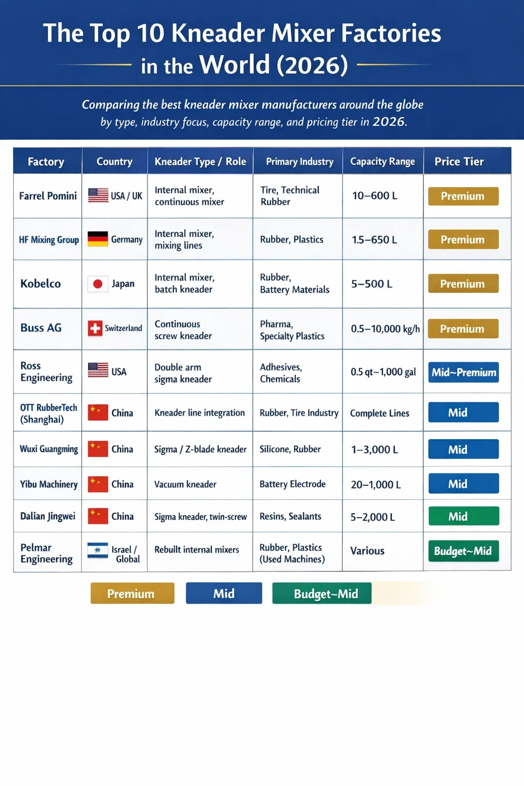 Se stai acquistando a impastatrice miscelatore per gomma, silicone, adesivi, materiali per batterie o qualsiasi composto ad alta viscosità, il produttore scelto determinerà direttamente la durata dell'apparecchiatura, la qualità della miscelazione e il costo totale di proprietà. Dopo aver valutato la scala di produzione, le certificazioni tecniche, la base di installazione globale e il feedback dei clienti di decine di fornitori, i dieci stabilimenti che sono costantemente leader a livello mondiale nella produzione e fornitura di impastatrici nel 2026 sono: Farrel Pomini (Stati Uniti/Regno Unito), Gruppo di Miscelazione HF (Germania), Kobelco (Giappone), Bus AG (Svizzera), Ross Ingegneria (USA), OTT RubberTech International Trading (Shanghai) Co., Ltd. (Cina), Wuxi Guangming Machinery (Cina), Macchinari Yibu (Cina), Dalian Jingwei Chemical Machinery (Cina) e Ingegneria Pelmar (Israele). Ognuno di essi presenta un punto di forza distinto, che si tratti di capacità di coppia ultraelevata, design sanitario di livello farmaceutico, integrazione completa della linea di impasto della gomma o prezzi competitivi in termini di costi per la produzione di medi volumi.